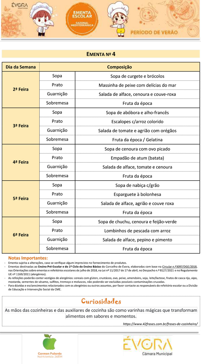 Ementa Escolar – 6 a 10 de outubro