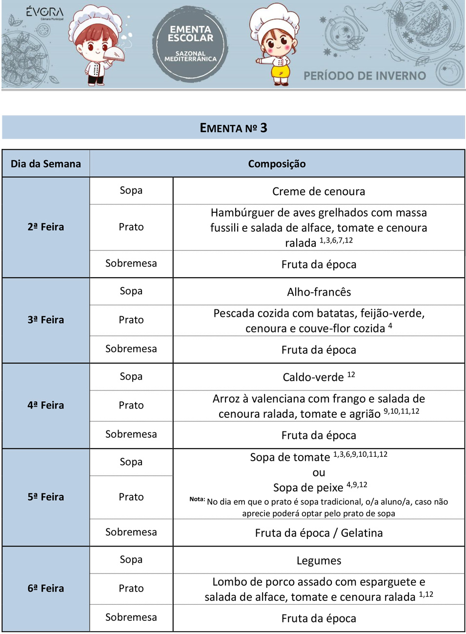 Ementa Escolar – semana de 26 a 30 de janeiro